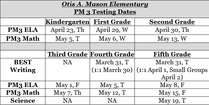 Progress Monitoring 3 for grades 4 and 5 will include a writing portion that assess your child’s progress in writing. Please see this attached Testing Letter for information regarding this important component of state testing: PM3.Writing Parent Letter.Grade 45
