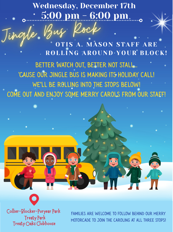 Join our OMES Staff as we travel to YOUR Neighborhood! Jingle Bus Rock will be 12/17
