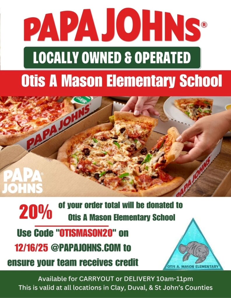 Spirit Day 12/16 at Papa Johns! Slices for Schools: